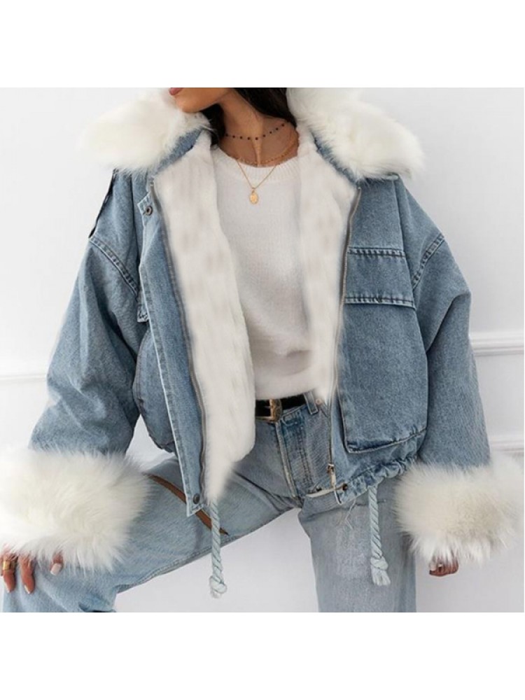 Casual Denim Fake Fur Patchwork Loose Short Coats