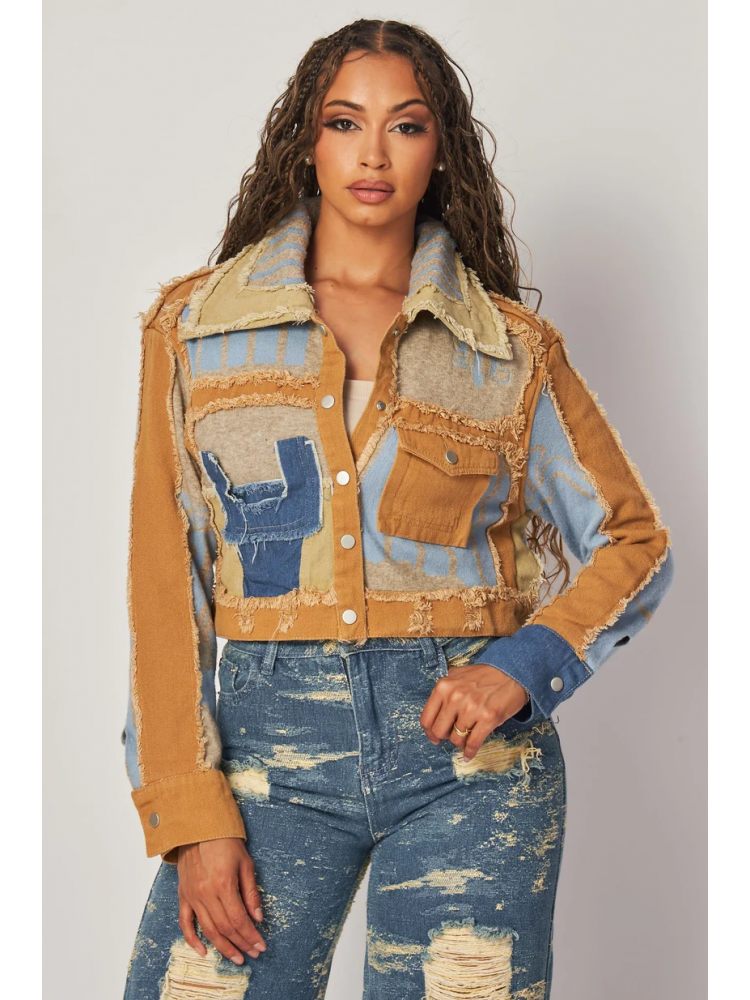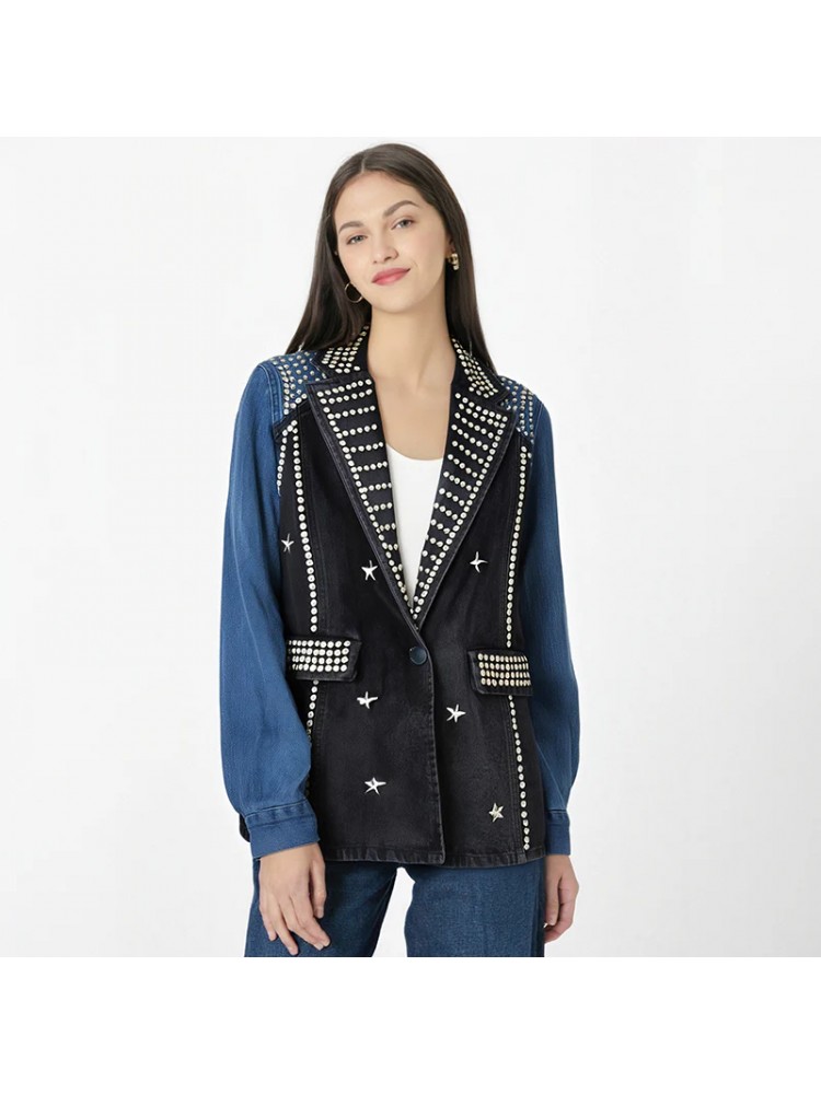 Colorblock Fuzzy Trim Lapel Denim Jackets