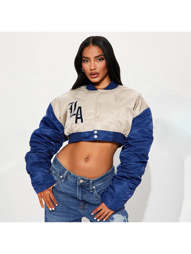 Ruched Embroidery Cropped Bomber Jacket