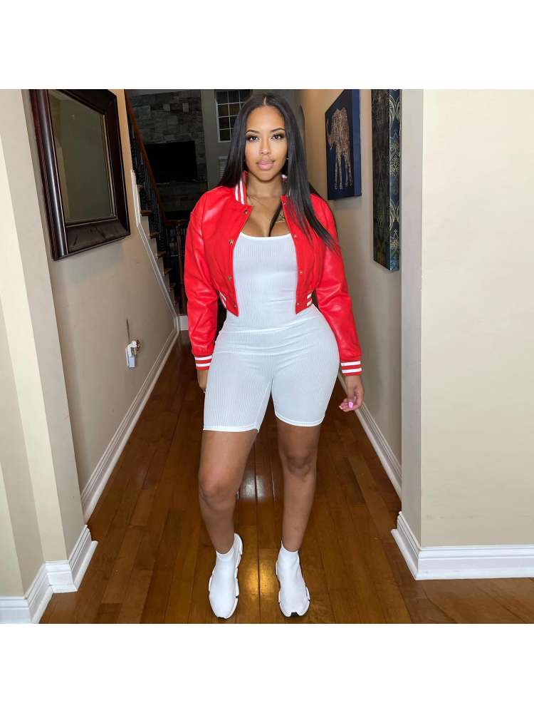 Striped Trim Ribbed PU Cropped Bomber Jacket